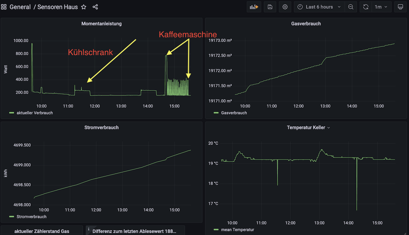 Über Grafana habe ich nun den Gesamtverbrauch von Gas und Strom im Überblick und kann verschiedene Verbraucher zuordnen und gezielt abschalten, um Strom zu sparen. Beim Gas gibt es nur "heizen" oder "nicht heizen". Da wird man kaum Abstriche machen können. Zumindest kann man testen, ob zB die Abschaltung einer Zirkulation für Warmwasser Einsparungen bringt oder ob das eher wenig ausmacht.