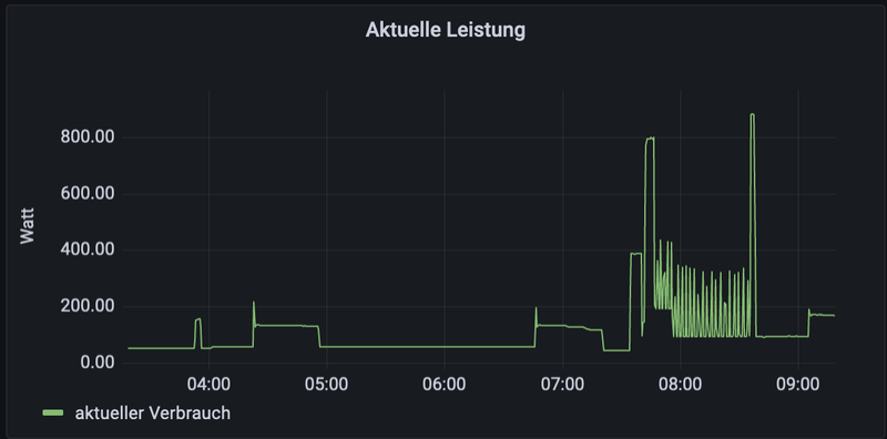 In der Grafik sieht man bspw. das Einschalten verschiedener Verbraucher wie z.B. den Kühlschrank oder morgens die Kaffeemaschine mit periodischem Einschalten der Heizplatte. Unser dauerhafter Grundverbrauch liegt übrigens bei 50W. D.h. das sind dann Geräte, die im Standby laufen oder Verbraucher wie Radiowecker o.ä.