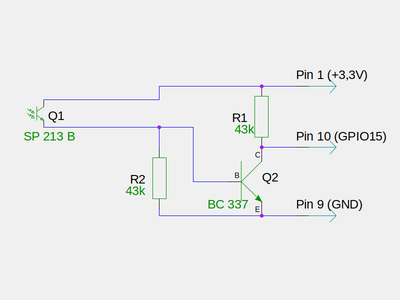 Ich habe die Schaltung aus (1) weitestgehend übernommen. Als Widerstände habe ich aber 2 x 43 kOhm (R1 und R2) genommen, weil ich die gerade rumliegen hatte. Als IR-Fototransistor fand ich noch einen SP213 B aus alten DDR-Beständen (Q1). Und anstelle des BC547 nahm ich einen BC337 von Siemens (Q2), der auch übrig war. Hier habe ich also nichts zukaufen müssen.