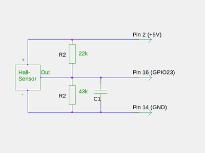 Ein vorhandener Hall-Sensor aus DDR-Beständen (B461) war ebenfalls nicht empfindlich genug für das Magnetfeld des Gaszählers. Hier mußte ich bei reichelt.de den SS 441 nachkaufen. Der SS 441 ist ein Open Collector IC, d.h. man verbindet den Ausgang mit dem IO-Port des Raspi. Sowohl der B461 als auch der SS 441 arbeiten mit 5V als Versorgungsspannung. Der Ausgang muß also über einen Spannungsteiler auf die max. erlaubten 3,3 V abgesenkt werden.