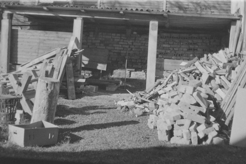 In der Dunkelkammer schnitt ich ein kurzes 5cm langes Stück von der Filmrolle. Eine alte Practica VLC3 diente als Fotoapparat. Es gelang mir, diesen kurzen Filmstreifen irgendwie bei völliger Dunkelheit in die Praktica einzulegen. Dann habe ich ein einziges Foto geschossen. Dazu hatte ich den Aufzug schon vor dem Einlegen gespannt, damit der Film nicht durch den Transportmechanismus verschoben wird.