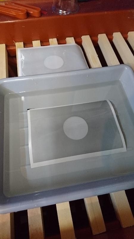 Bestellt hatte ich FOMA Fomabrom C 112 - Totmatt (Baryt) 12,7x17,8 CM (5x7 INCH) / 25 Blatt. Bervor es also richtig losgeht: der Schleiertest. Mit diesem Test wird geprüft, ob noch Rest- oder Streulicht die Entwicklung stört. Also wieder mein ORWO BH1 hergenommen, kurz belichtet (1s) und dann einen Dealerbutton aus meinem Pokerkoffer auf das Fotopapier gelegt. Nach ca. 1-2 Minuten dann den Entwicklungsprozess gestartet.